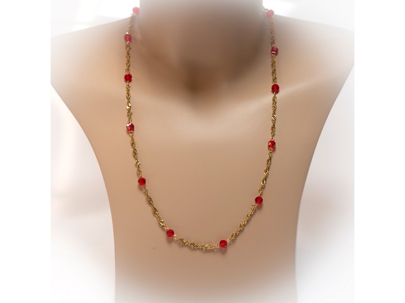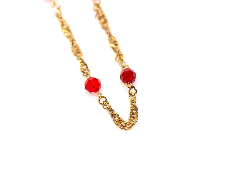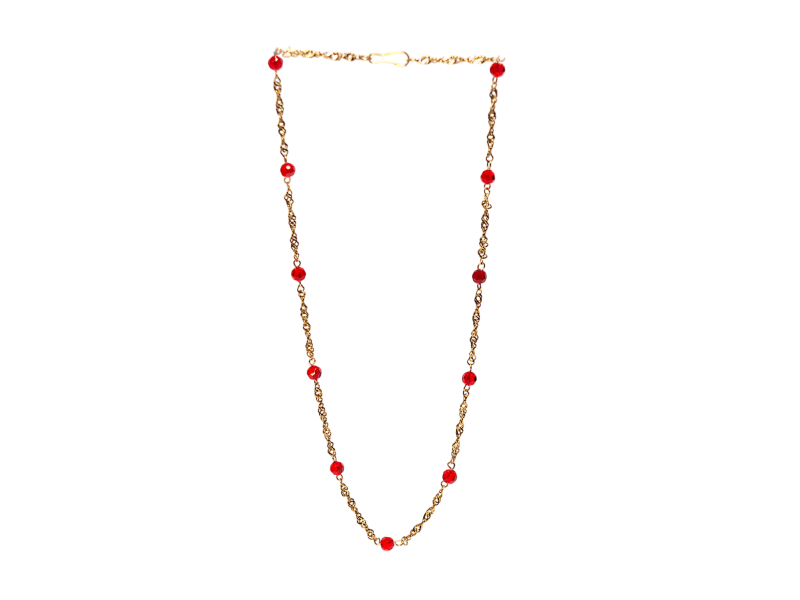 Bij ons koop je de mooiste Surinaamse sieraden in stainless steel, zoals deze goudkleurige stainless steel tara te ketting met rode ogri ai kralen.
