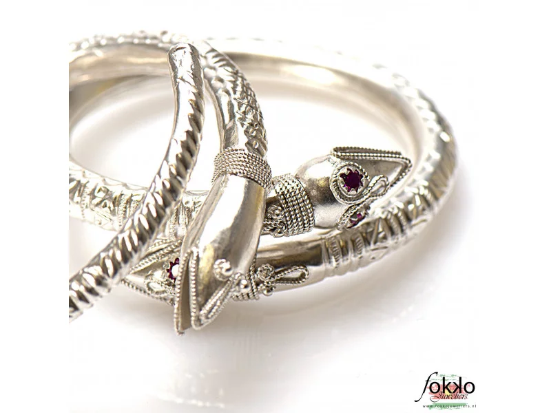 Deze Surinaamse slavenarmband met slangenkoppen bezet met robijnen van Fokko Design heeft een stijlvol Surinaams design met een goede oog voor de details. Deze Surinaamse slavenarmband met slangenkoppen heeft een culturele betekenis.
