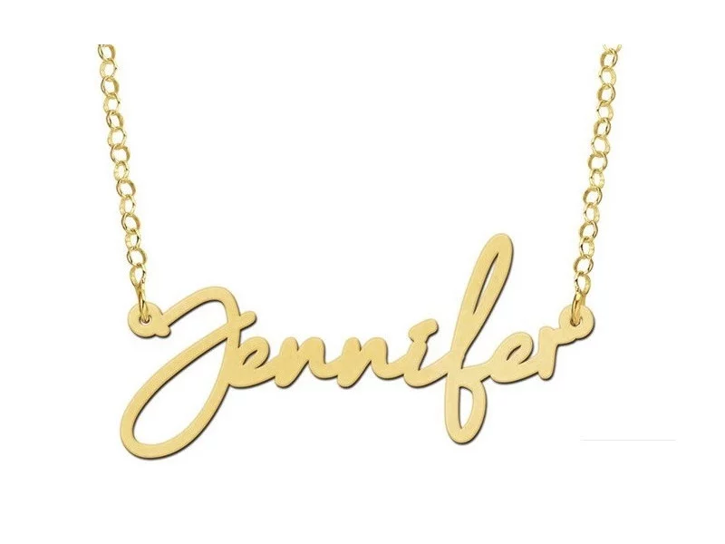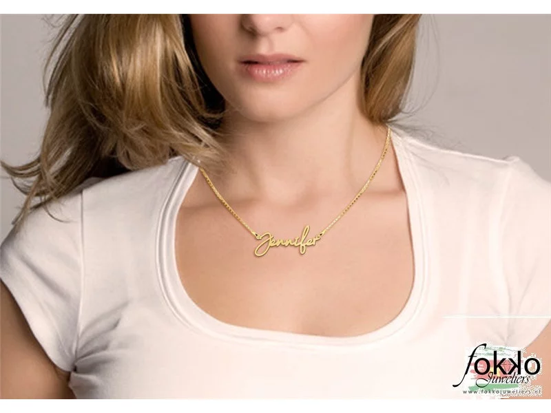 Deze gouden naamketting word geleverd aan een gouden jasseron schakel collier van 42 cm. De gouden naamketting heeft een prachtige elegante vorm lettertype en is buitengewoon trendy.